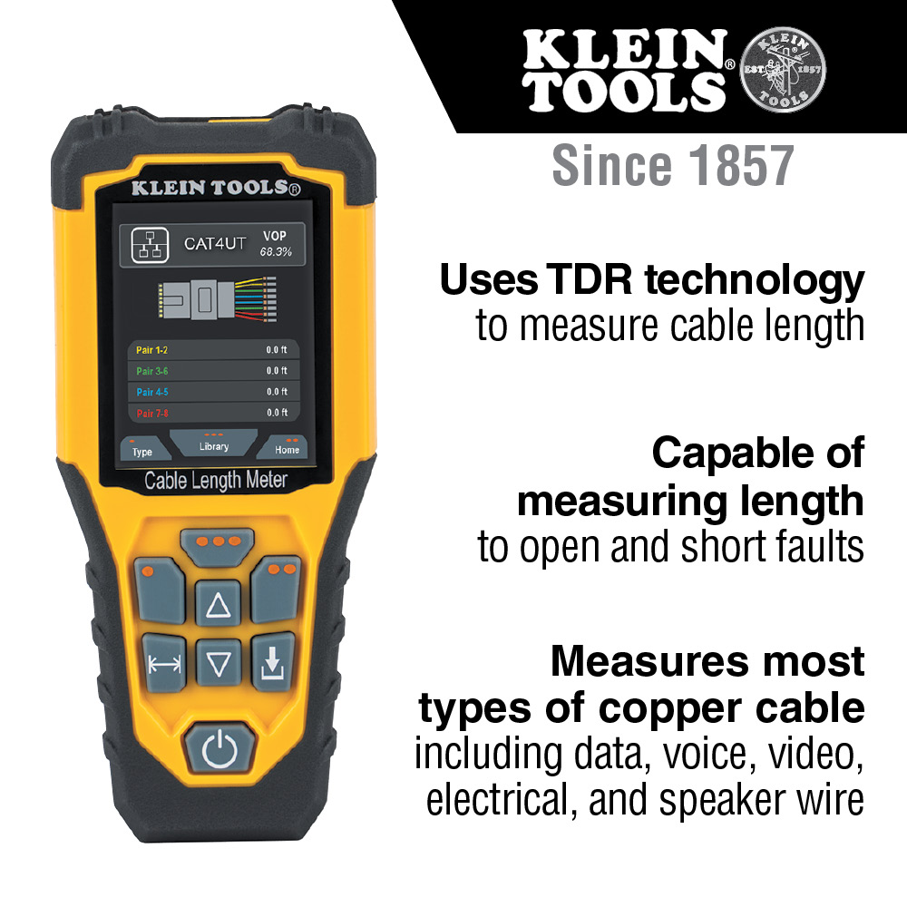 The Klein Tools Cable Length Meter is a portable Time Domain Reflectometry (TDR) cable length tester. It measures cable length, calibrates Velocity of Propagation (VoP) values, finds distance to faults in cables, and provides built-in tone generation for cable tracing. This tester provides accurate cable length measurement for a wide variety of cable types at an affordable price. Includes test leads and a carrying case.