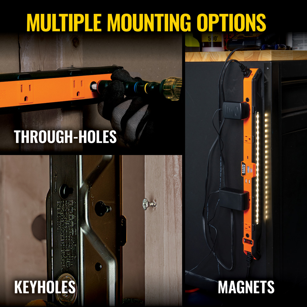 Klein Tools' 2-Foot Power Strip Pro helps provide efficient power distribution for your workspace. Outlets for power adapters and bulky plugs, plus a motion sensor LED light for easy tool location. Features five surge-protected 120V AC outlets, two USB-A and one USB-C port for charging phones, tablets, laptops, and more. Stay energized and organized with this versatile power strip.