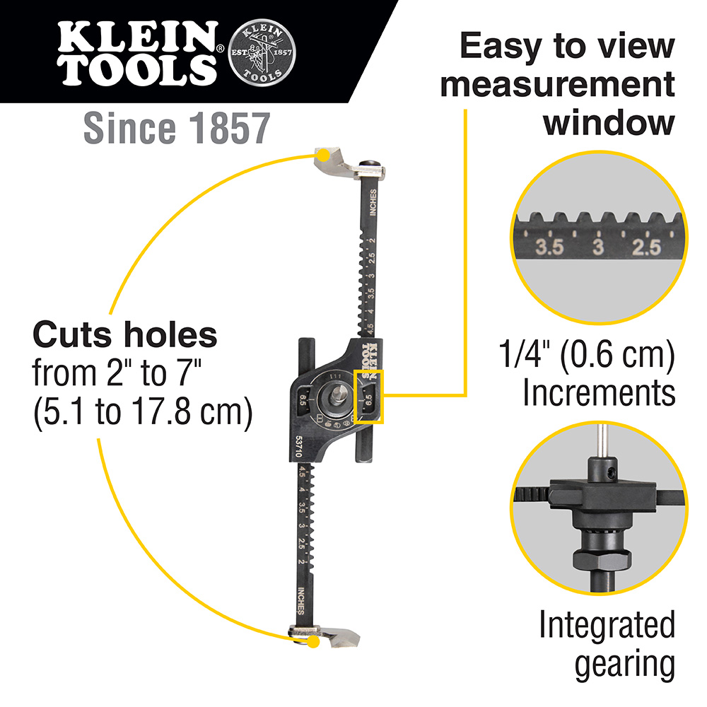 The Adjustable Hole Saw with Auto-Set Arms provides smooth cuts from 2 to 7-Inches (5.1 to 17.8 cm) in drywall and ceiling tile
