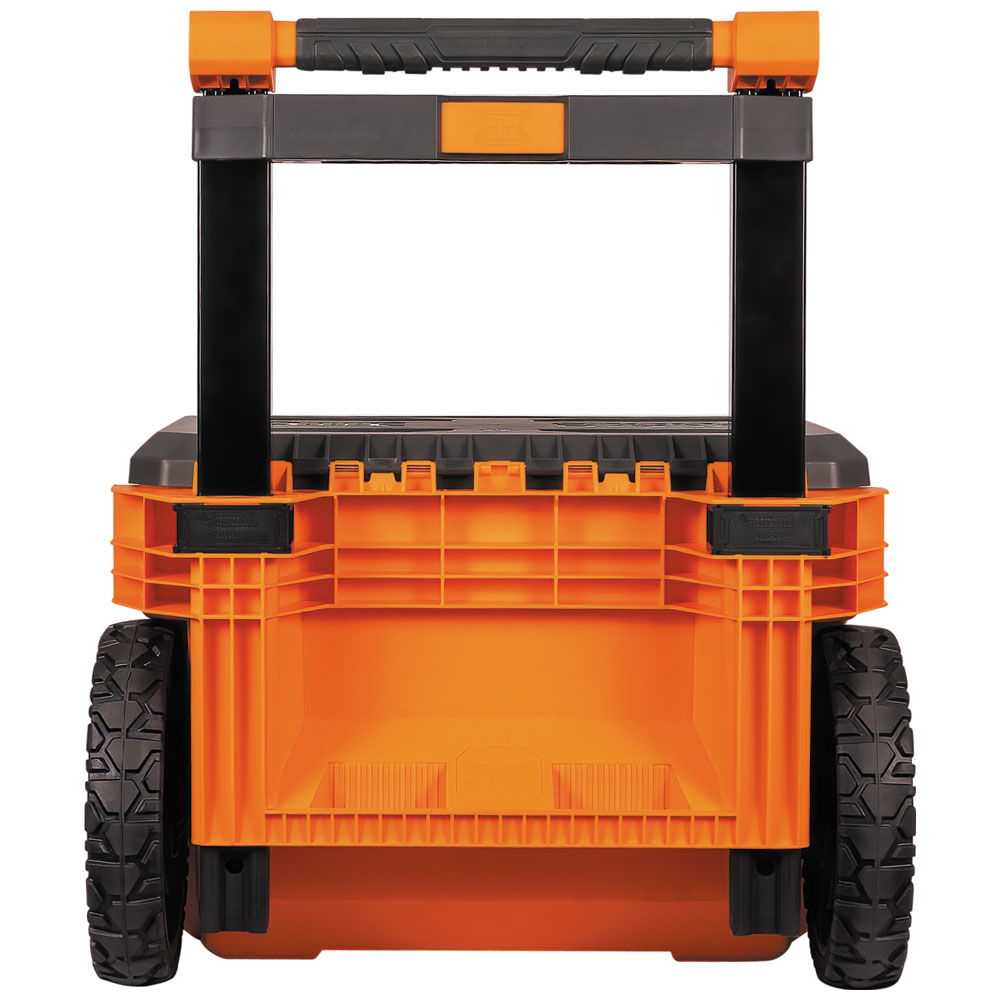 Klein Tools MODbox™ Rolling tool box organizer has 10-Inch solid rubber wheels that are larger and more durable than the leading competitor. The retractable handle is easy to remove for storage in tight spaces. Bring more tools to the jobsite with side rail attachments and back stowage compartments. This stackable tool box is IP65 rated, 250-Pound capacity, and made with heavy duty impact resistant polymers. Easily connects with other MODbox™ components to make a custom mobile workstation.