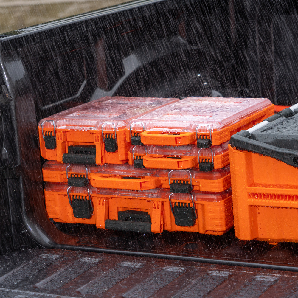 Toolbox is made with impact resistant polymers and is IP65 rated for protection against debris and rain