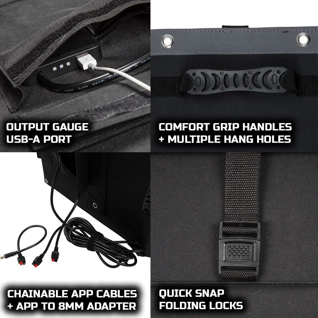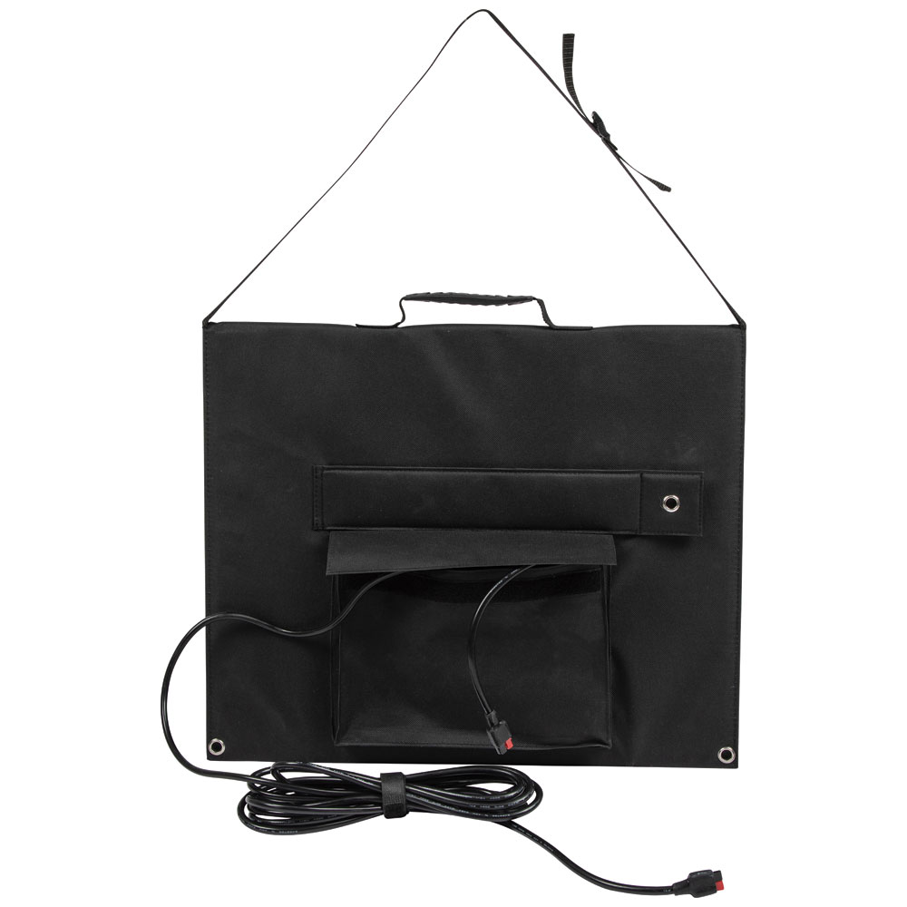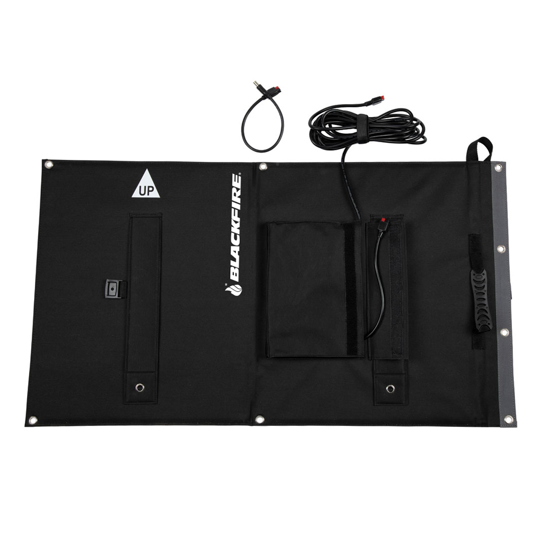 The Blackfire 60W Portable Solar Panel enables you to recharge your life no matter how off the grid you are. This solar panel is capable of charging both the Blackfire PAC505 500W Portable Power Station and the Blackfire PAC1000 1500W Portable Power Station. This solar panel is easily carried anywhere and is most effective in perfect sun conditions. This panel comes equipped with Anderson APP cables (for PAC1000) and an 8mm port converter (for PAC505). In addition, you have the ability to charge small devices through the included USB-A port located inside the storage pouch on this solar panel. Monitoring your solar power input can be measured from led meter located inside the solar panel pouch or on the display of your portable power station. Blackfire Solar Panels are chainable allowing you to link multiple panels together to increase the amount of solar power charging your portable power station. This portable solar panel comes with kick stand legs allowing you to position it perfectly in the direction of the sun for optimal charging. In addition, the Blackfire 60W Solar Panel has included grommet holes allowing you to stake the panel down into the ground incase of wind, mount your solar panel from a hook or nail, or bungee strap to the roof of a car. Blackfire Solar Panels perform the best when in optimal sunlight so be sure to keep out of the shade and position directly at the sun for the best performance. Blackfire Solar Panels are built with durable canvas material to survive the elements and withstand abuse. In addition, these solar panels are water resistant in case they are caught in weather.