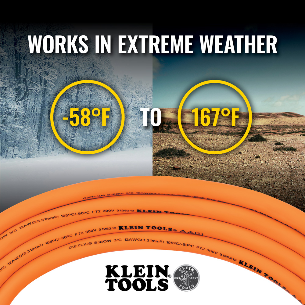 The Klein Tools 25-Foot Glow End Extension Cord is equipped with LED indicators that illuminate 20 times brighter than standard indicators when powered. This unique design features glowing male and female plug ends, providing optimal visibility for indication and convenience on the job. Its heavy-duty 12/3 AWG construction is engineered to withstand both indoor and outdoor conditions. With the added advantage of a flexible SJEOW jacket, this extension cord excels in extreme temperatures, ensuring reliable power on-site or at home.