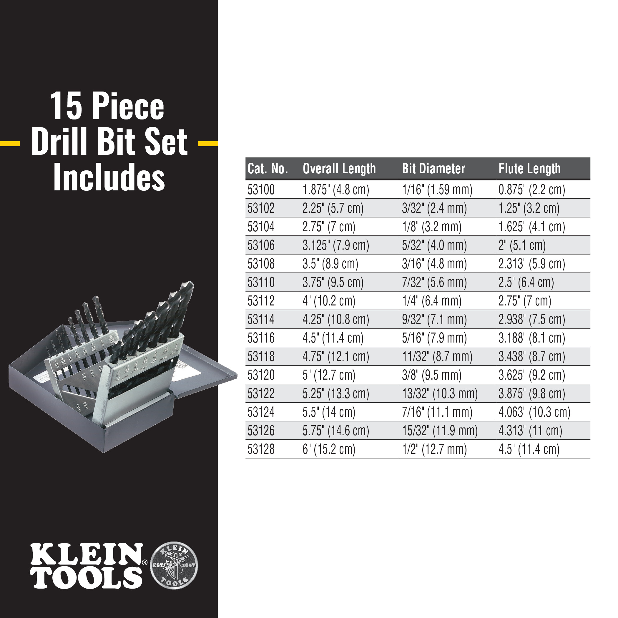 Klein Tools Regular-Point 118-degree High-Speed Drill Bits are suitable for general-purpose drilling applications. High-speed bits, in particular, provide a reliable performance in a wide range of materials. They are offered in a variety of different bit sizes and flute lengths for multiple applications.