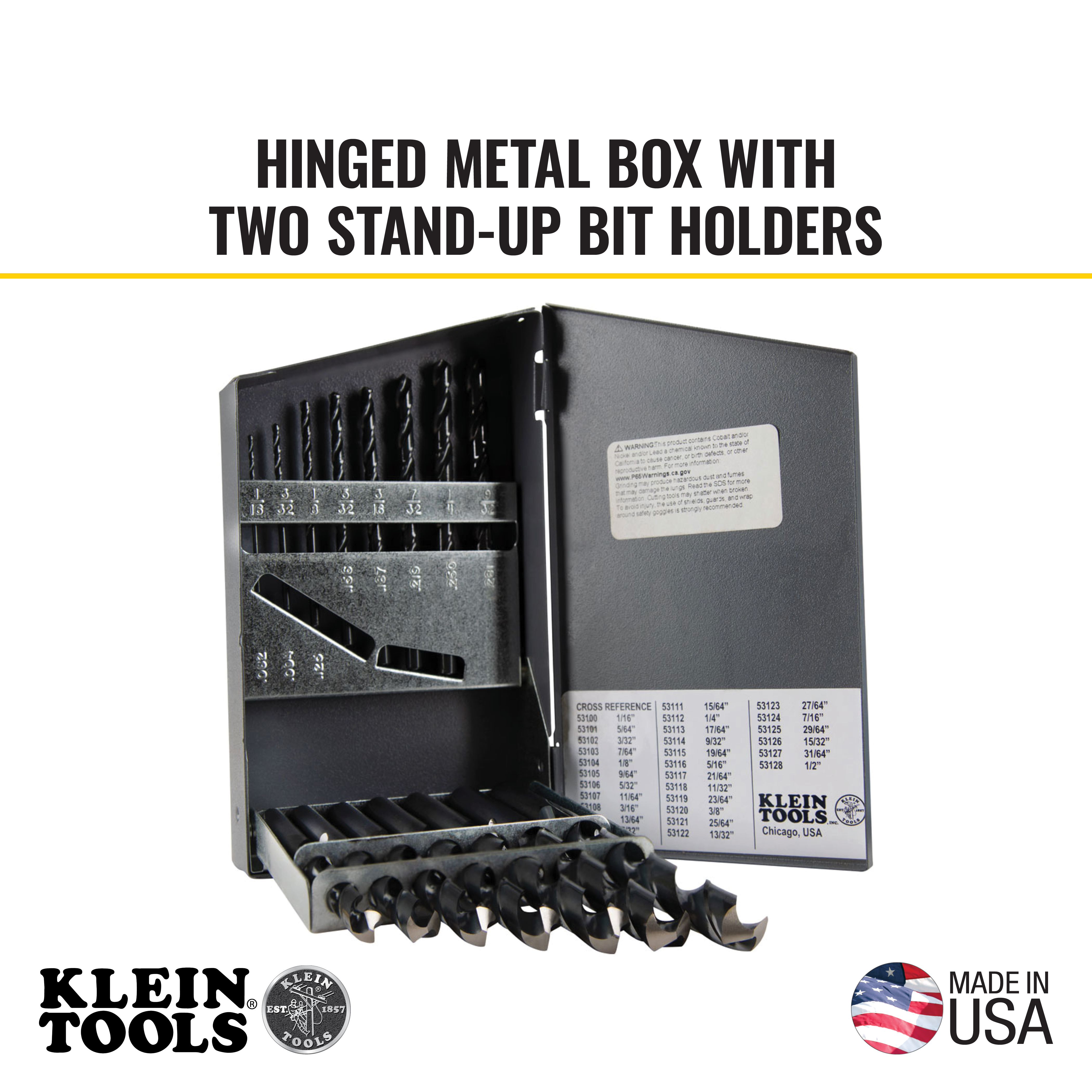 Hinged metal box with two stand-up bit holders