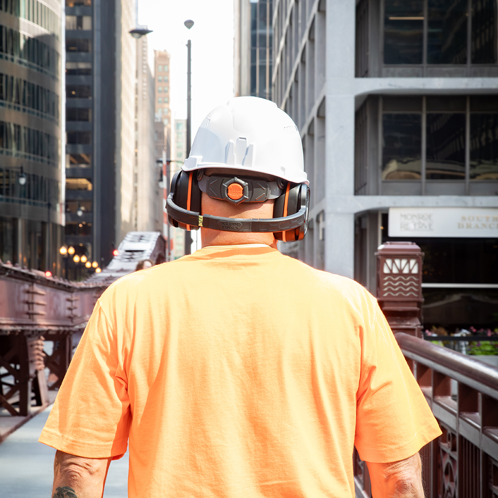 Unique and versatile behind-the-head design allows for earmuffs to be worn comfortably with hard hats and caps