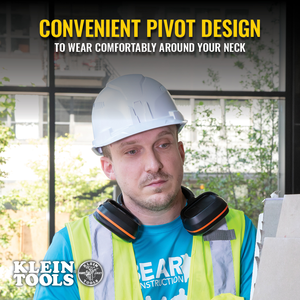Earmuff cups pivot to comfortably rest around neck and keep conveniently close when not in use