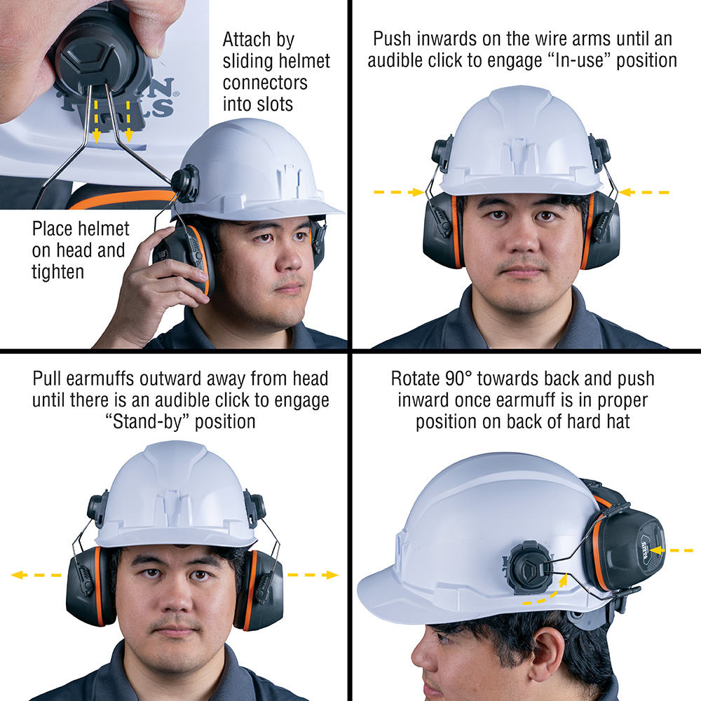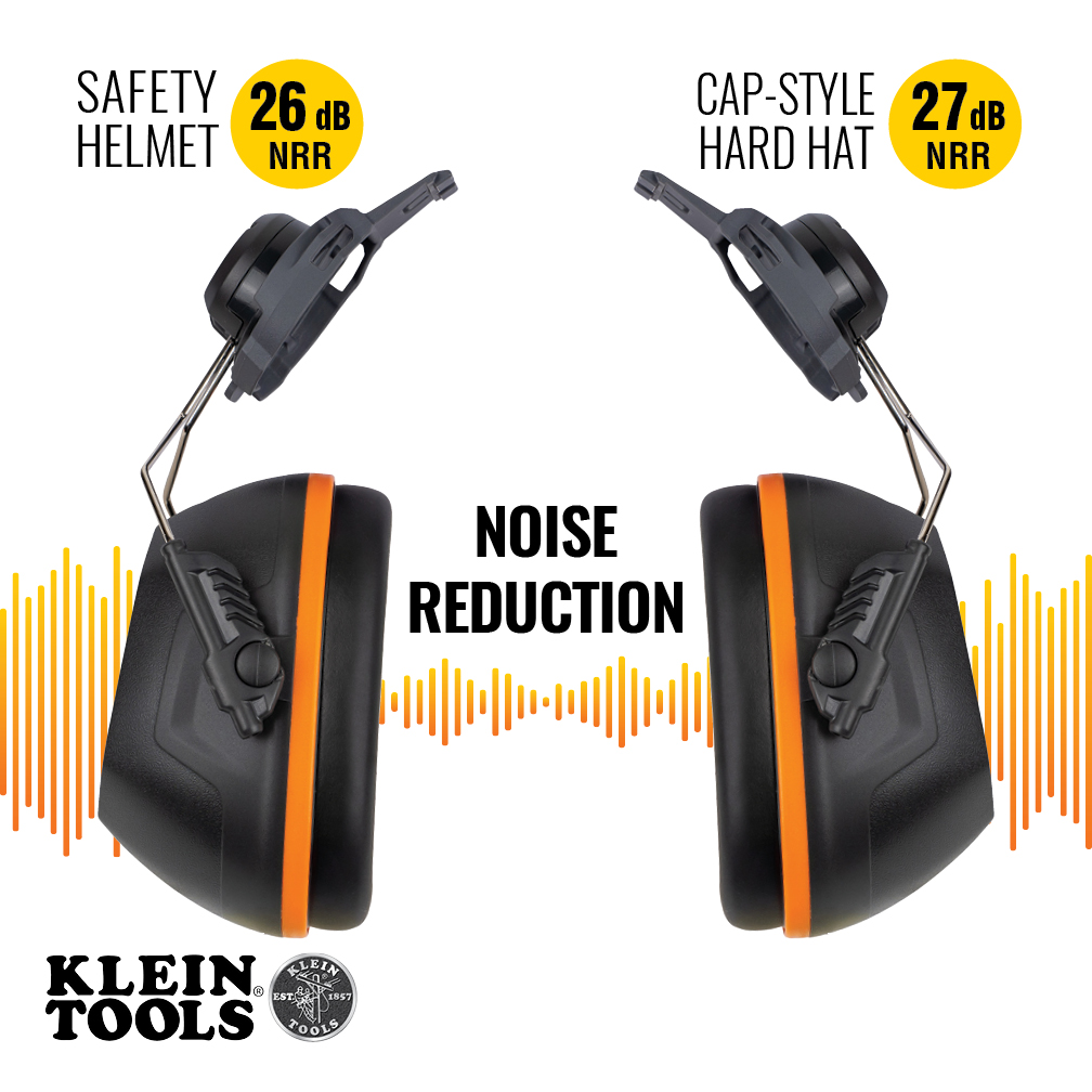 Klein Tools Cap Style Hard Hat Earmuffs are designed to work with all Klein Tools Safety Helmets and Cap Style Hard Hats, and are intended to provide limited protection from harmful noise. Tested in accordance with ANSI S3.19-1974 standards, the NRR (noise reduction rating) for these earmuffs is 27dB when paired with Klein Tools Cap Style Hard Hats, and 26dB when paired with Klein Tools Safety Helmets. Designed for all-day comfort and effective acoustic seal.