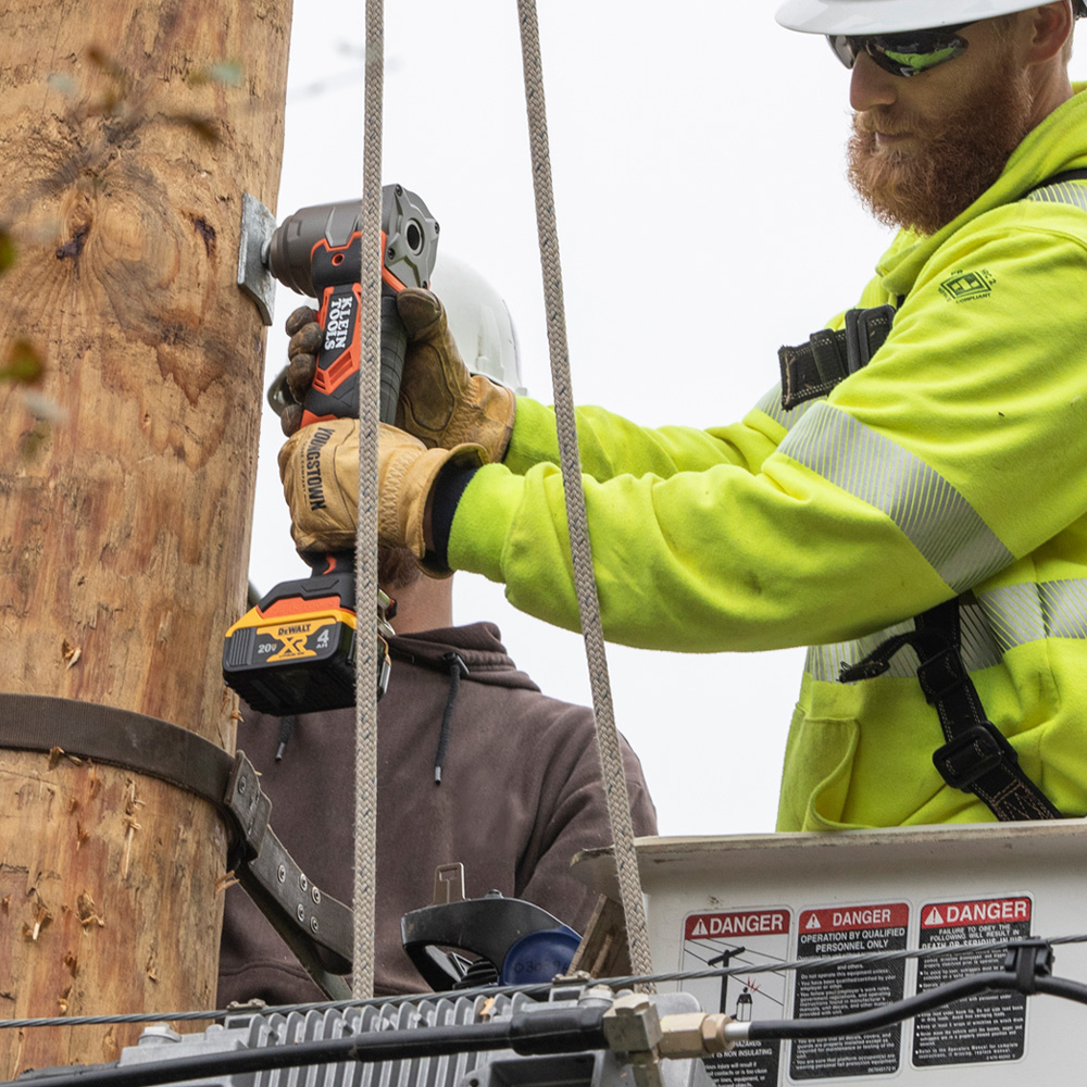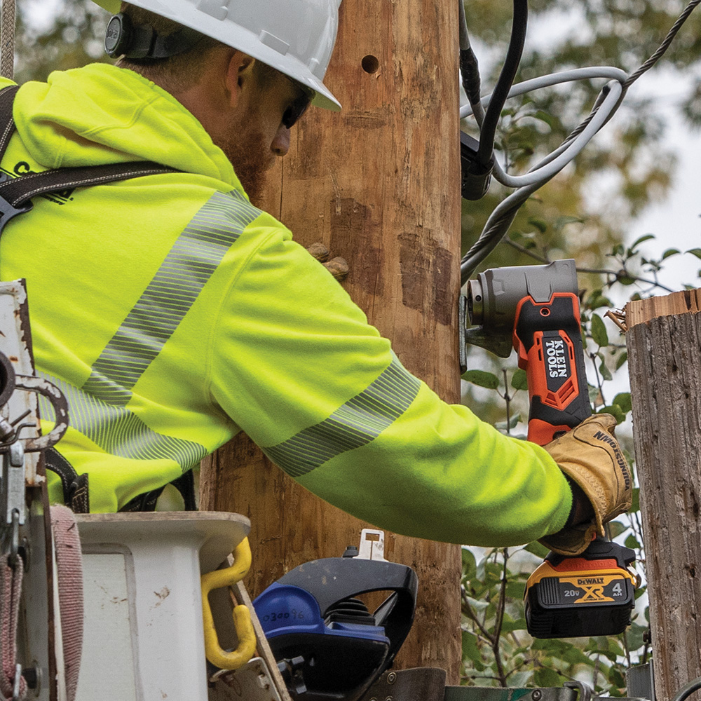 • Right angle impact wrench provides versatility for better reach around a utility pole with less effort