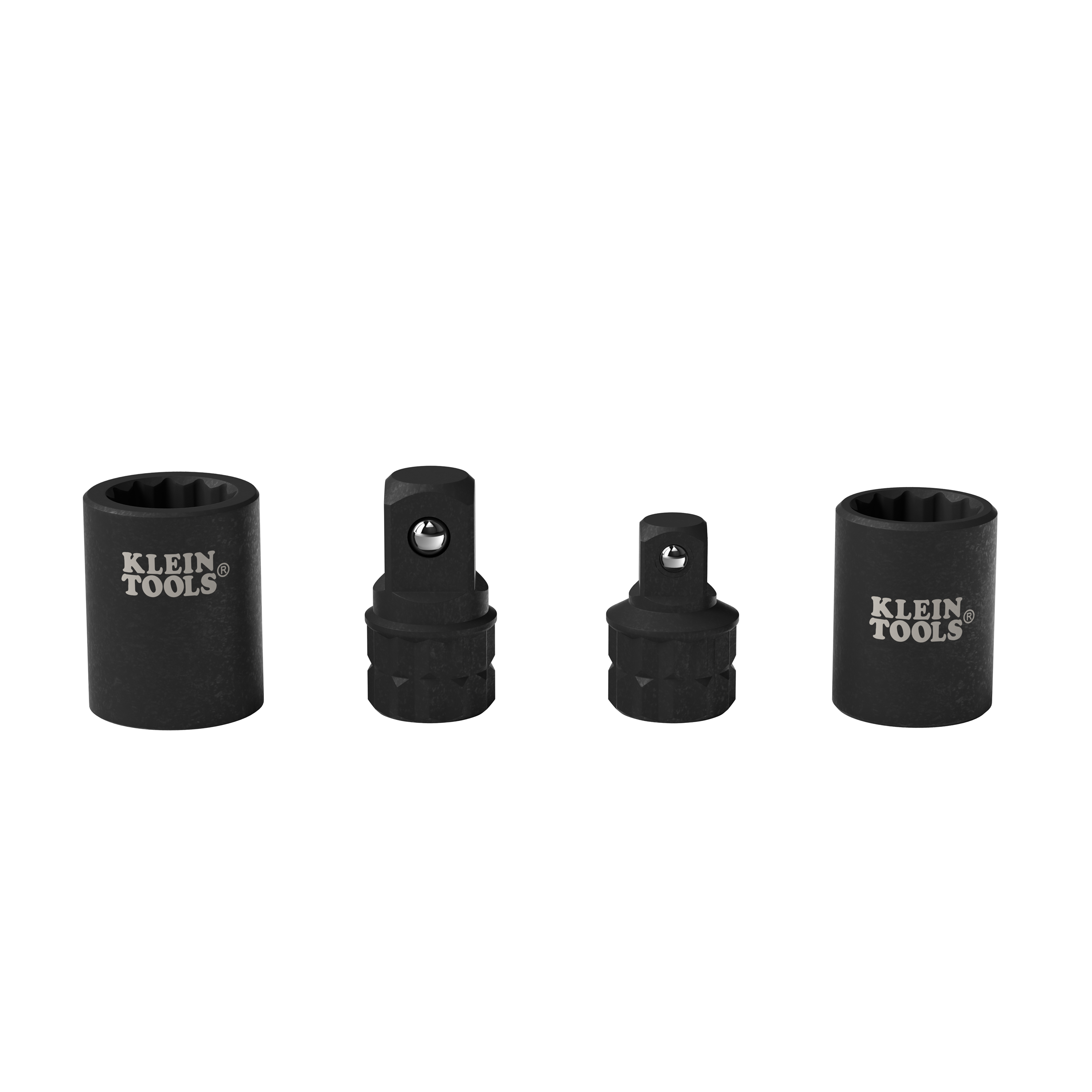 The Klein Tools KNECT™ system is an impact-rated, cross-compatible driver and ratchet system for efficient driving tasks. KNECT™ (M) impact socket wrench adapter set features four adapters to equip you for any driving situation. These adapters connect 3/8-Inch and 1/2-Inch square drive sockets to the KNECT™ (M) pass-through socket wrench. Use pass-through sockets on 3/8-Inch or 1/2-Inch impact wrenches and square drive ratchets.