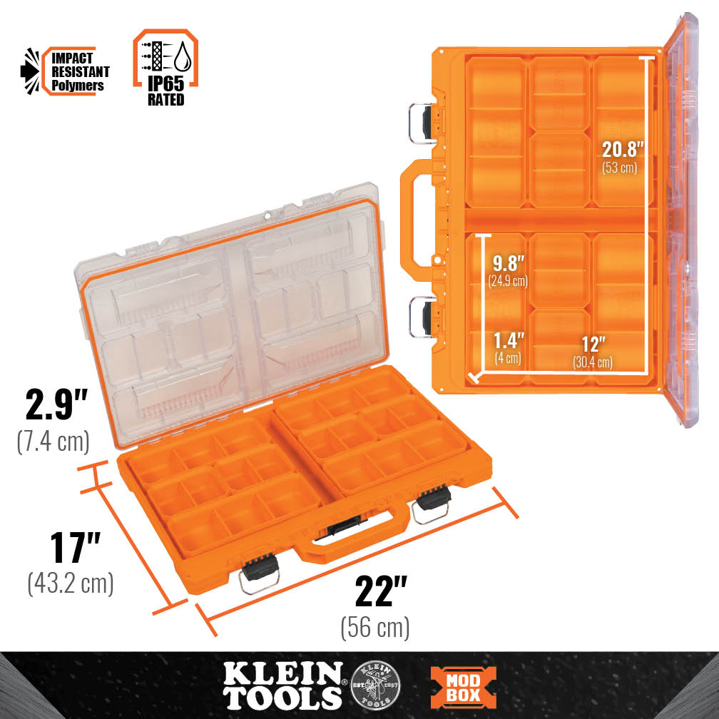 Klein Tools MODbox™ Short Component Box, Full Width comes with 8 removable storage bins and a stay-put lid design to keep contents from shifting. The clear lid provides an easy view of contents such as wire nuts and fasteners. Component box is IP65 rated and made with impact resistant polymers. Easily connects with other MODbox™ components to make a custom mobile workstation.