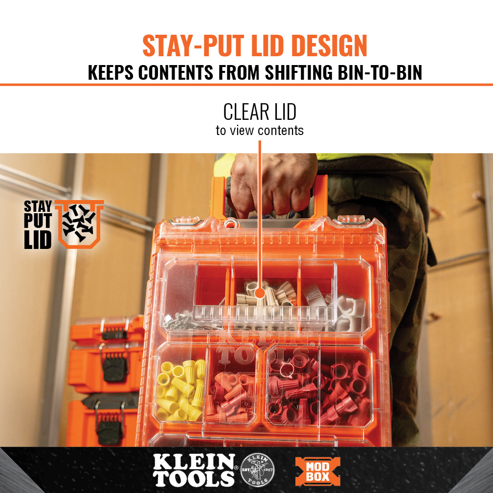 Klein Tools MODbox™ Tall tool box organizer, Half Width comes with 4 removable storage bins and a stay-put lid design to keep contents from shifting. The clear lid provides an easy view of contents such as wire nuts and fasteners. Stackable tool box is IP65 rated and made with impact resistant polymers. Easily connects with other MODbox™ components to make a custom mobile workstation.