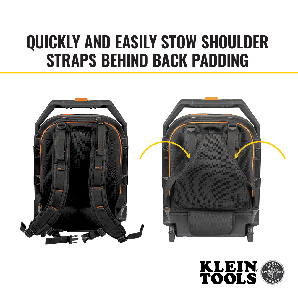Klein Tools Tradesman Pro™ Rolling Tool Backpack (Cat. No. 55604) converts easily into a rolling tool bag when carrying heavy loads. No need to worry about the terrain ahead with the 3-Inch heavy-duty wheels that can truck through unpaved paths. The rugged, telescoping handle easily extends and wraps along the backpack sides to provide extra support and stability when maneuvering around corners. Multiple interior and exterior pockets allow for maximum tool storage.