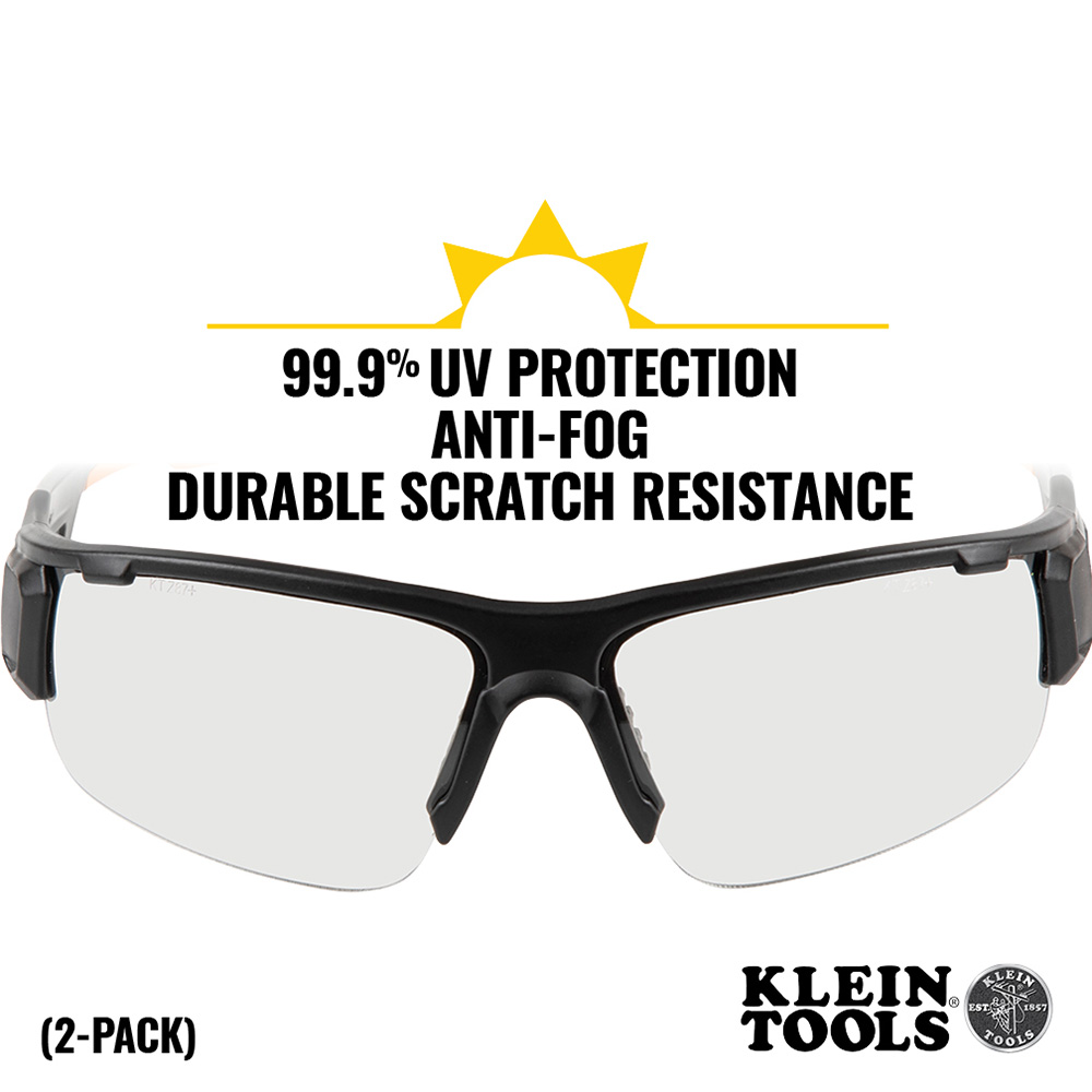 Klein Tools Professional Safety Glasses are high-quality protective eyewear that feature an anti-fog coating that won't wear off. Scratch resistant clear lenses with UV protection block 99.9% of harmful UV rays. Lightweight and flexible materials for long-term comfort with rubber nose piece and temples for face conforming fit and sure grip. This is a 2-pack. Optional Hard Case (Cat. No. 60176) and Breakaway Lanyard (Cat. No. 60177) sold separately.