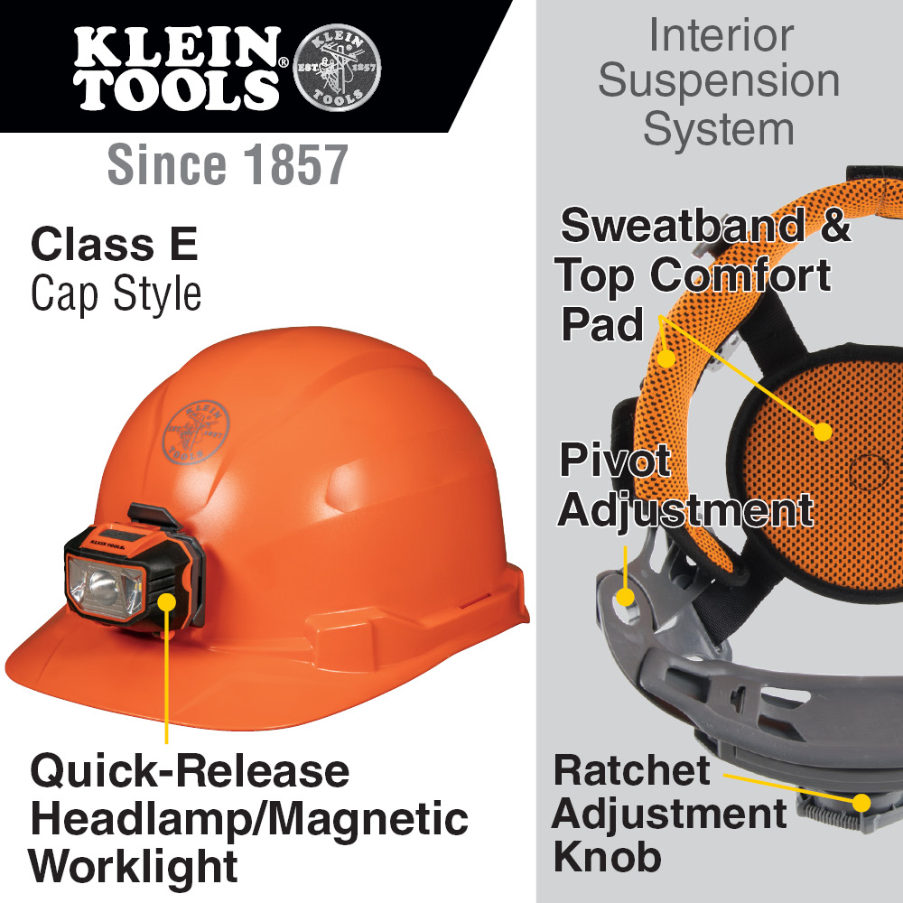 Klein Tools Hard Hats were designed and engineered for optimal safety, comfort and fit. Unique features allow the user to comfortably work in a wide variety of applications and demanding environments. Patent-pending accessory mounts on front and back ensure Klein Headlamps attach securely -- no straps needed!