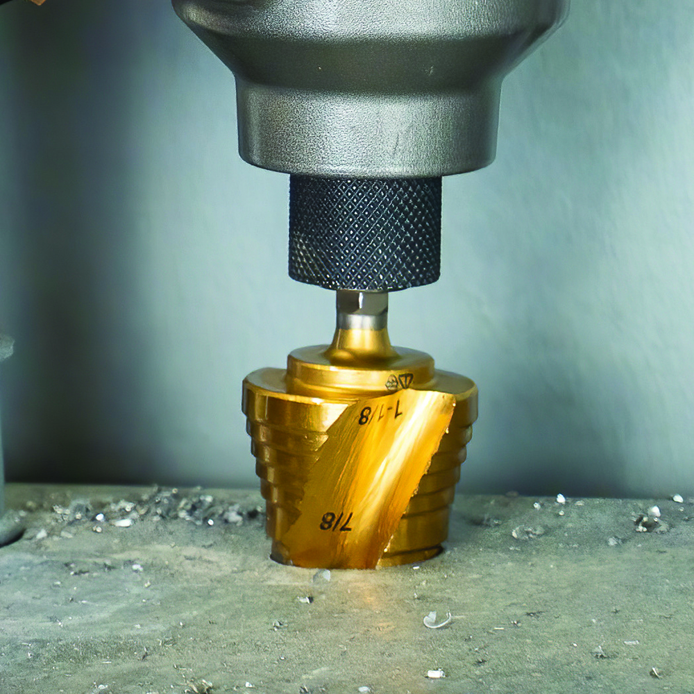 2 spiral flutes on each step drill bit remove chips and help pull the bit through material for faster cutting