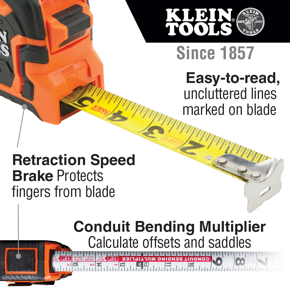 Klein Tools Tape Measures offer inventive first-rate features derived from jobsite professionals, to make jobs easier and more efficient. A sealed tape brake panel is large enough to allow 2-3 fingers to operate at once for safe retraction, and keeps water and dirt out to prevent tape blade rust and degradation. The high impact rugged, rubberized industrial design of this non-magnetic single-hook tape offers a good grip and stands up to basic demands of the jobsite.