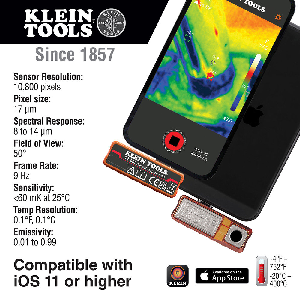 The Klein Tools TI222 Thermal Imager for iOS Devices has 10,800 pixels delivering excellent resolution to troubleshoot hot and cold spots. This Thermal Imager is perfect for detecting hot spots in panels, on wiring, or on parts of equipment; helping find sources of energy loss within a home/building; helps detect moisture behind walls and flooring; clogs in pipes; and much more. Fits phone cases up to 1/16-Inch (1.5 mm). Phone cases thicker than 1/16-Inch (1.5 mm) may require removal of case for secure connection. Easily capture, store, and share thermal images and video through the Klein Tools Thermal Imager App, available for free in the App Store.
