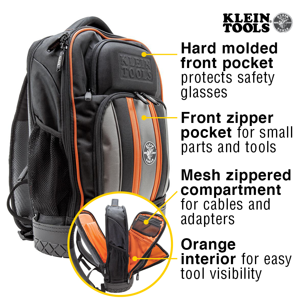 Klein Tools' Tradesman Pro Tablet Backpack features multiple pockets for plenty of tool storage, a separate interior padded pouch compartment for your tablet, a hard molded front outside pocket for safety glasses and a front zip pocket to store loose parts. The bright orange interior will help you find your tools faster. The durable molded base protects from the elements.