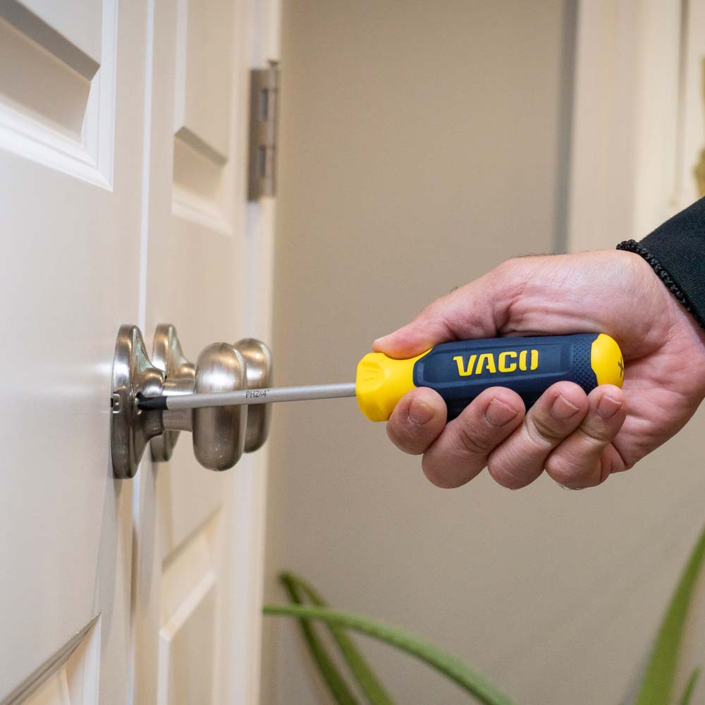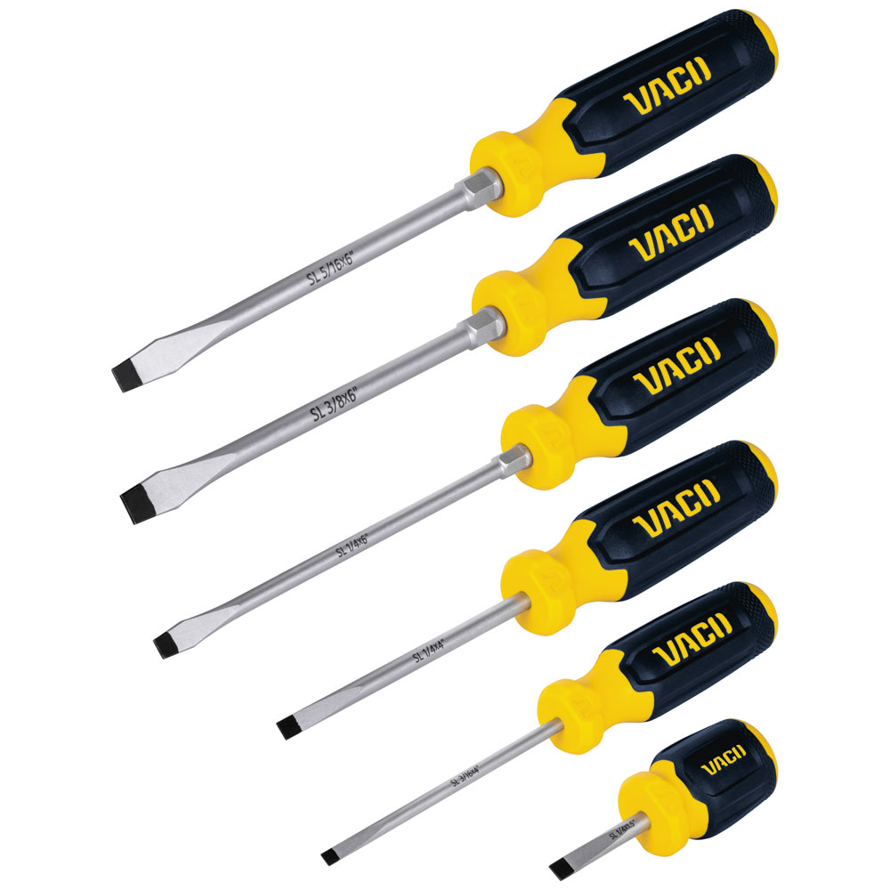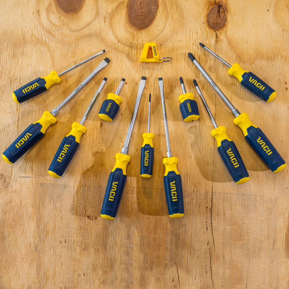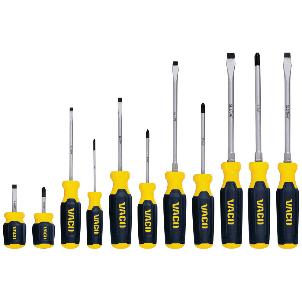 VACO's 12-Piece Phillips Slotted Screwdriver Set with Magnetizer offers exceptional versatility for various tasks that require Phillips and Slotted tip screwdrivers. With the included magnetizer, you can effortlessly magnetize or demagnetize the drivers based on your specific application needs. The screwdriver blades feature laser-etched markings, enabling easy identification of the right tip, while the handles have convenient markings on the base for quick visual reference. VACO screwdrivers are designed with comfort handles featuring a thumb indentation, ensuring comfortable grip and providing enhanced leverage during use.