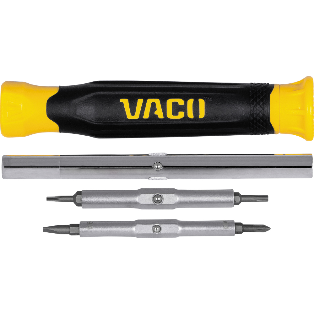 VACO's 14-in-1 Precision Screwdriver/Nut Driver features 14 of the most common precision sizes in one tool. The comfort grip handle and spin cap provide outstanding comfort and control. This smartly designed tool contains 6 sizes of integrated steel nut driver shafts that securely hold four double-ended screwdriver bits. Carefully heat-treated for industrial strength, the precision-milled bits include multiple sizes of slotted, Phillips and Tamperproof TORX® bits.
