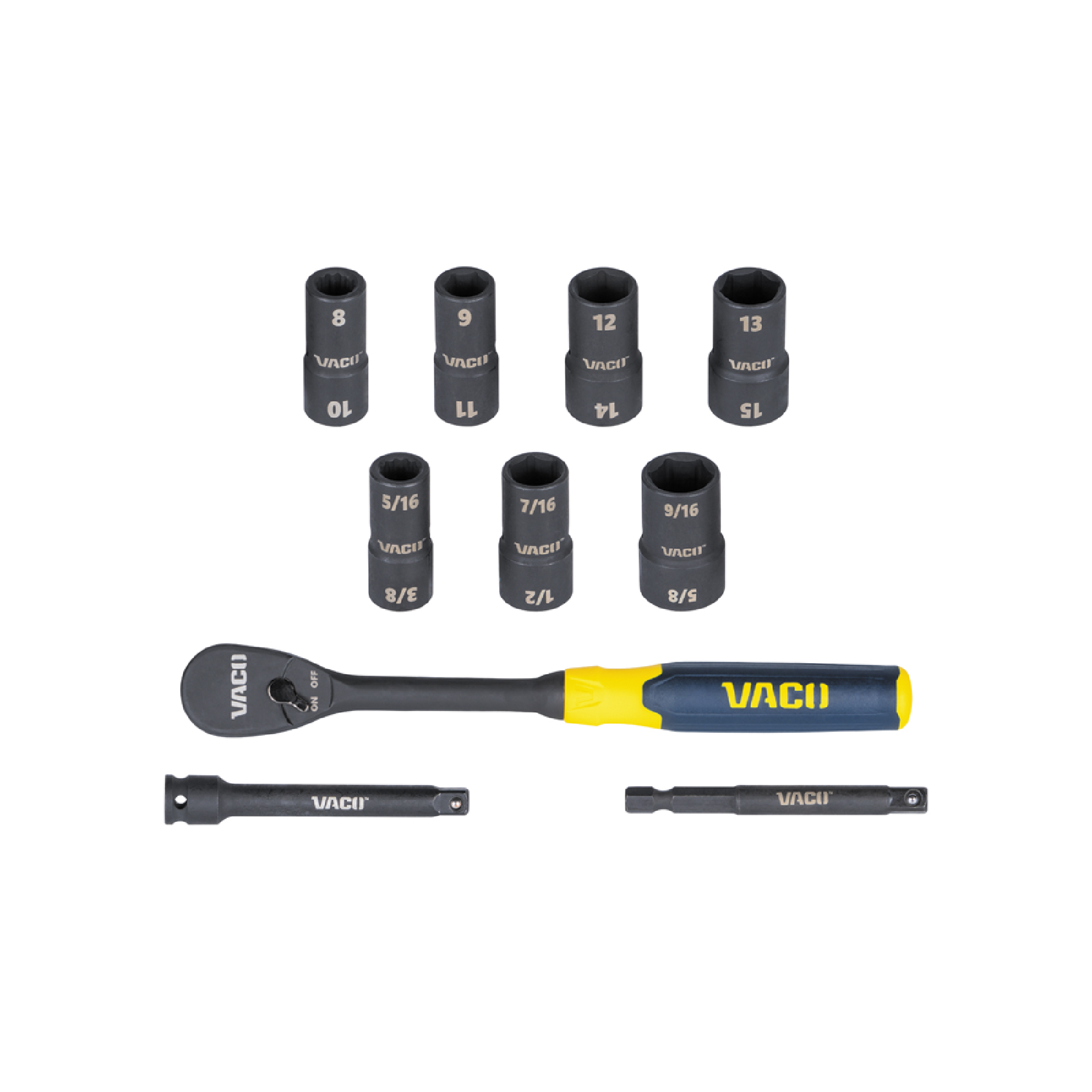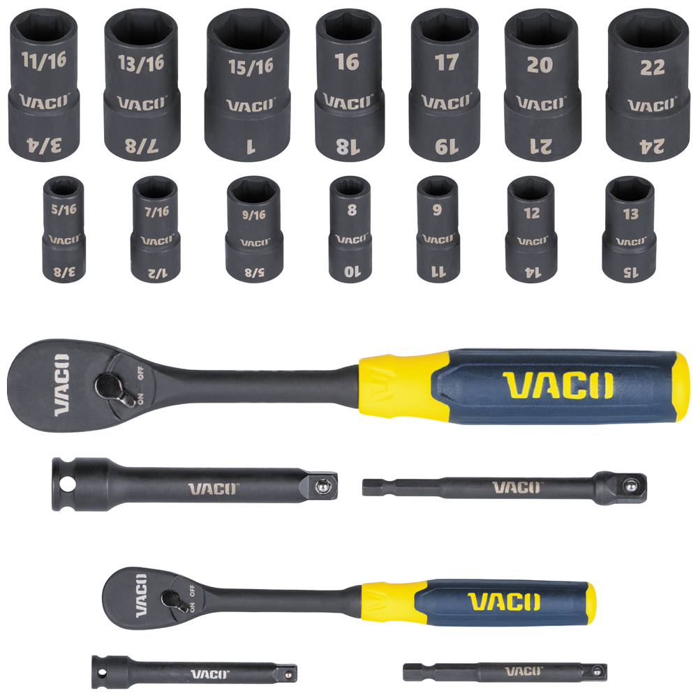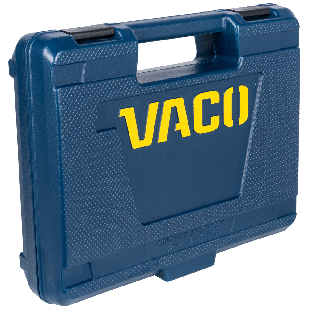 VACO's 20-Piece 2-in-1 Flip Socket Set includes 28 sizes combined into 14 sockets and adapters for impact drivers, wrenches, and ratchets. Easy-to-use flip feature allows for quick changes between sizes and reduces the number of tools in the tool bag. All sockets, adapters, and included ratchets store in a convenient case for easy portability.