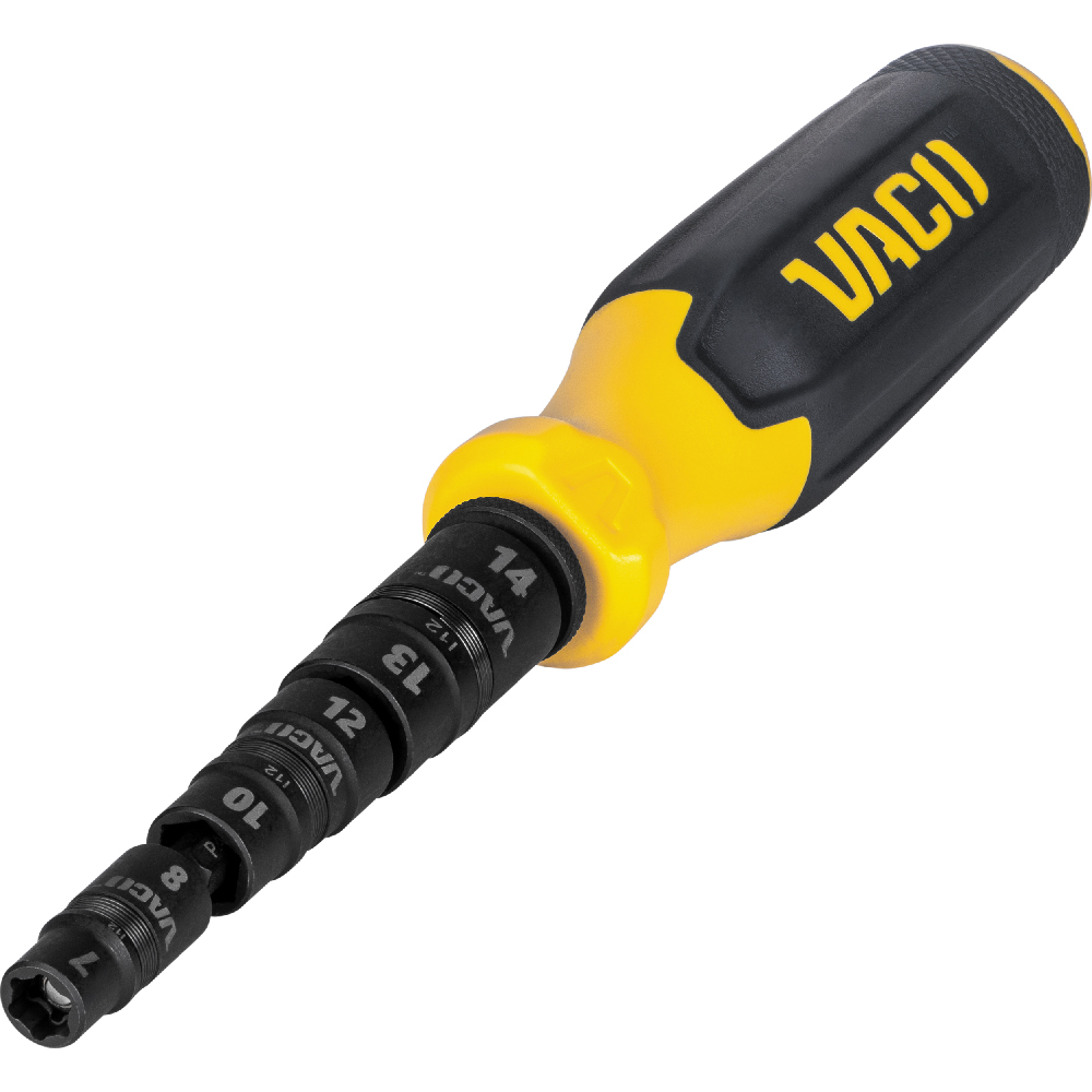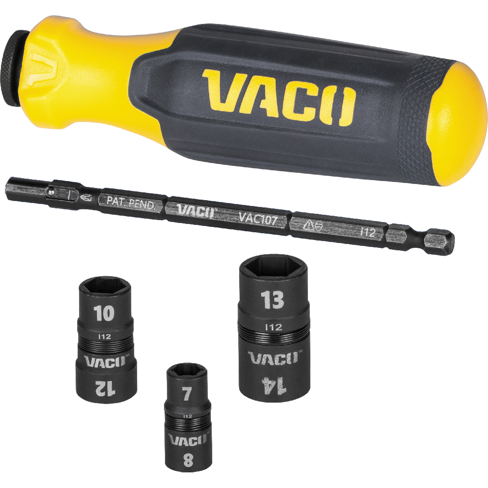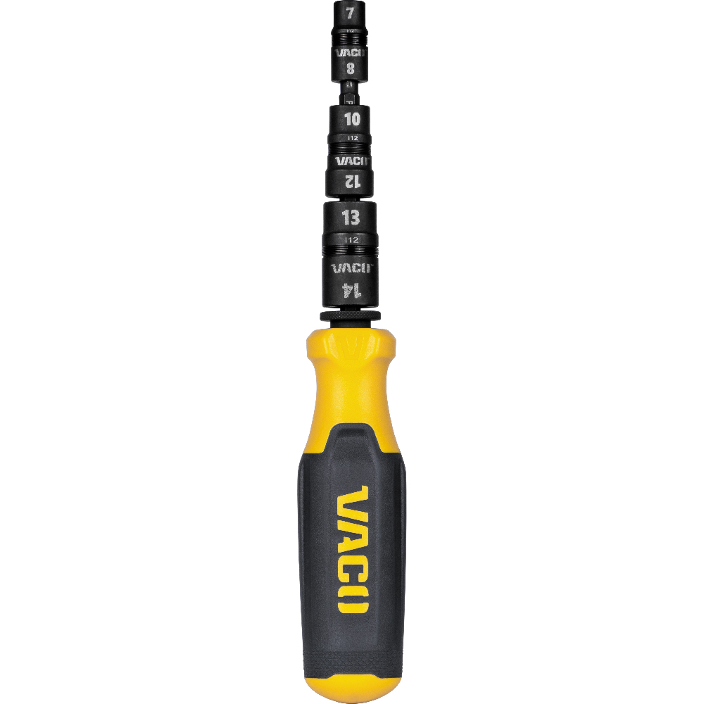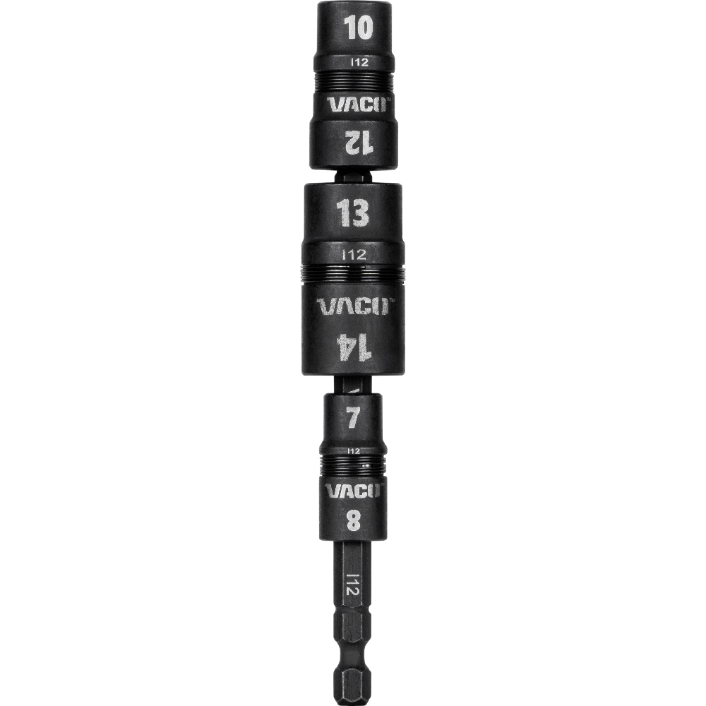 VACO's 7-in-1 Impact Flip Socket Set with Handle features reversible flip sockets. The sockets are easy to identify with bold laser markings and are stored on an impact rated shaft that can be used with any impact driver.