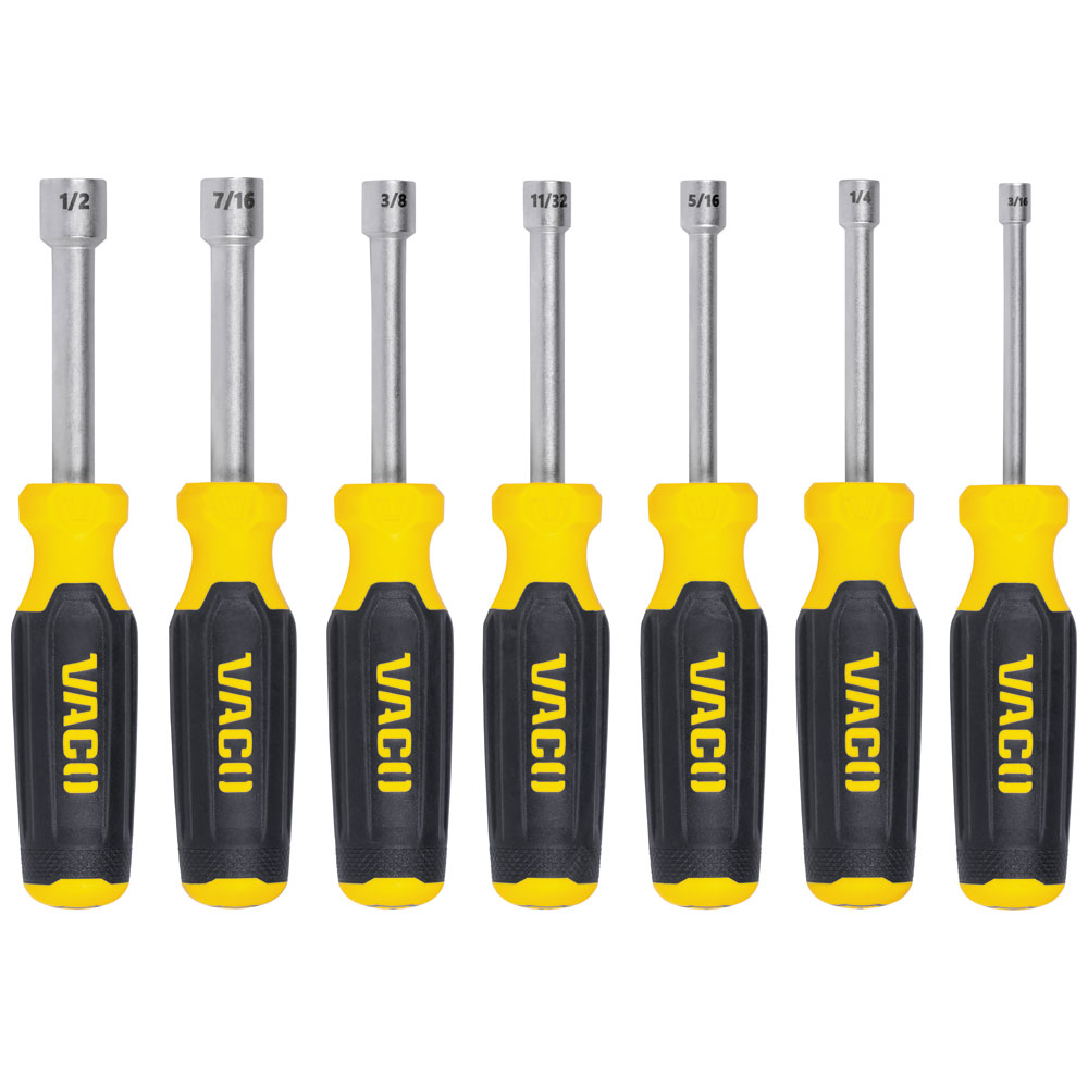 VACO's 7-Piece Nut Driver Set features 7 of the most popular SAE nut driver sizes. Perfect for any task, the magnetic tip keeps fasteners secured during use and the handle's grip provides more comfort and increased torque to get the job done. Easily identify the right size with laser etched blades and marking on the base of the handles.