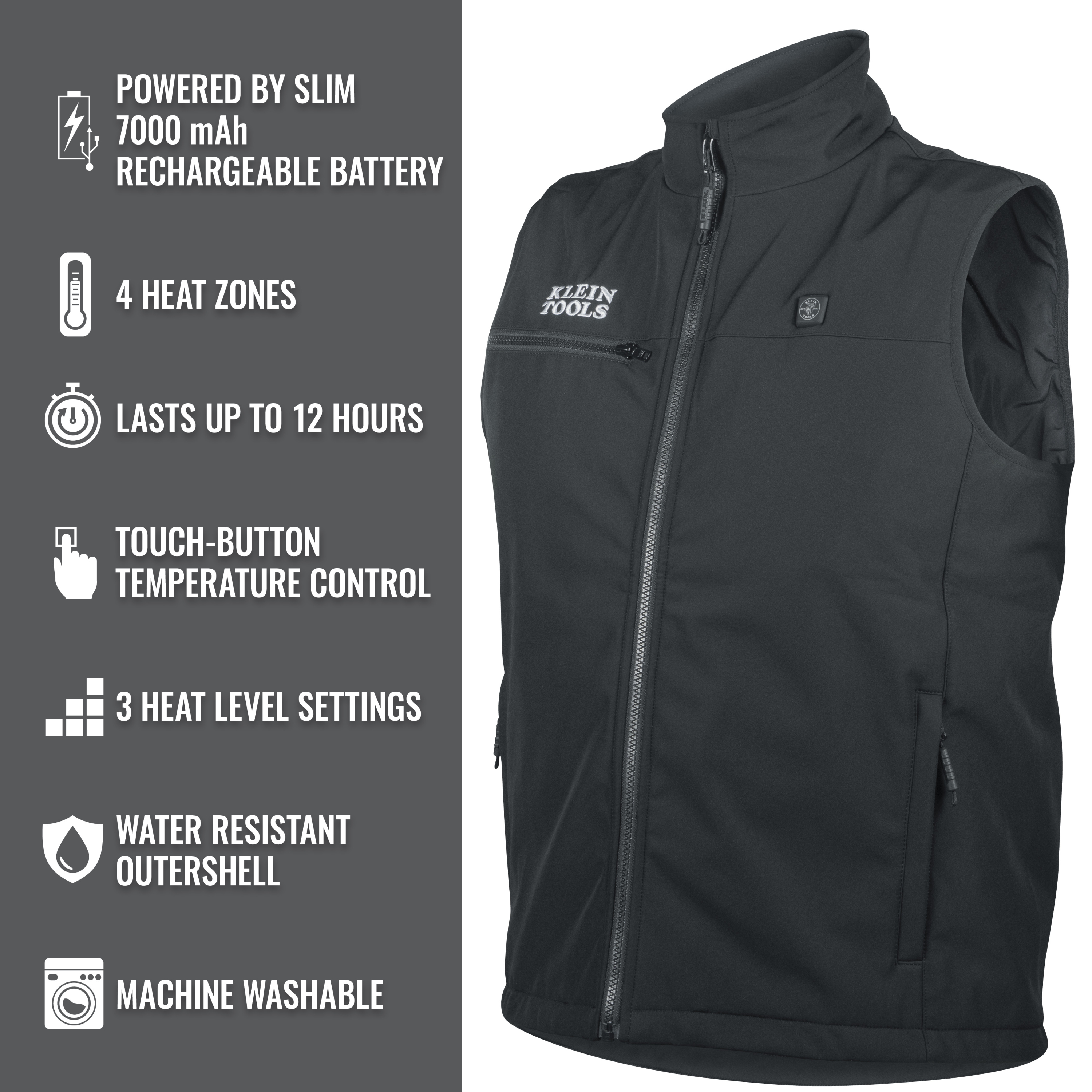 Klein Tools' Heated Base Layer Vest is designed to be a lightweight, low-profile insulated base layer vest perfect to wear under a jacket or other outerwear. A durable, weather-resistant exterior softshell design offers ultimate comfort for prolonged wear. Designed with four total pockets and an adjustable waist cinch to keep heat in. Three heat settings can be easily adjusted with the touch of a button. Battery is a compact, palm size with a large capacity that provides great runtime.